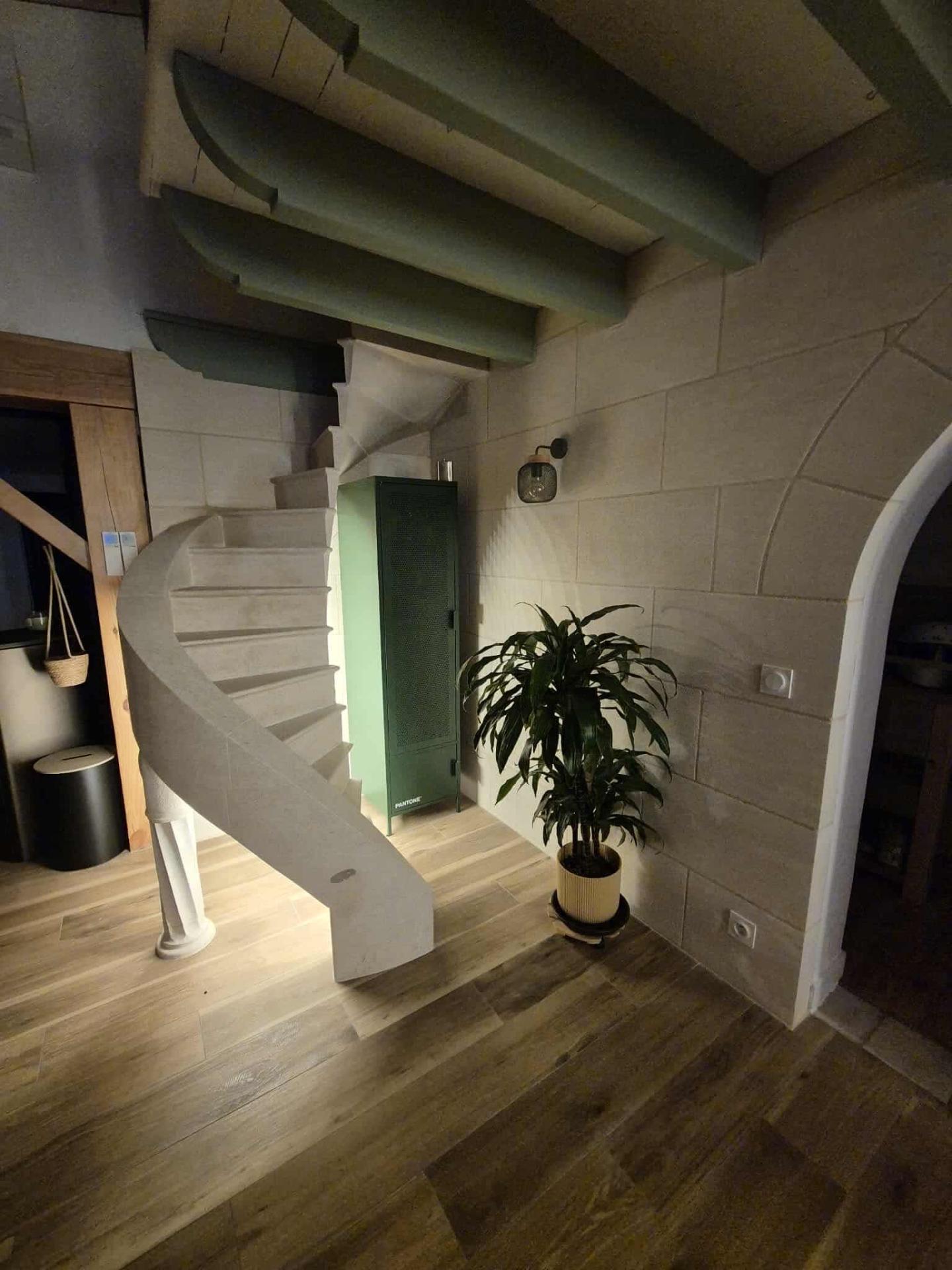 À La Teste-de-Buch, RPC Tailleur de Pierre a réalisé un escalier en pierre sur mesure, taillé intégralement dans son atelier. L’ensemble se distingue par sa complexité technique et sa qualité d’exécution : les limons débillardés, taillés dans la masse, constituent la véritable pièce maîtresse de cet ouvrage. Ils reposent sur une colonne torse, également taillée à la main. Chaque marche a été ajustée avec précision, dans le respect des règles de l’art. Ce chantier met en valeur notre savoir-faire artisanal en taille de pierre, au service d’un résultat durable, élégant et authentique.